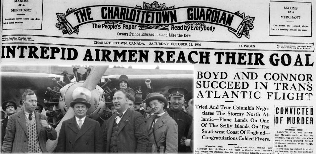 Just before supper on September 13, 1930, Reginald MacLean and his cousin Alfred McNeill were returning from a Saturday afternoon swim at MacRae’s shore at Tea Hill. As they approached the top of the farm, the boys were amazed at an airplane landing a short distance away. They approached the aircraft and saw two occupants dressed in caps, goggles, tunics, and breeches. One of the two men from the plane asked the boys where they were, and the boys replied that this was Tea Hill, Prince Edward Island.The aircraft was a Bellanca monoplane, christened Columbia, and piloted by Capt. Erroll Boyd and navigator, Lieut. Harry Connor. Captain Boyd, a native of Toronto, was a celebrated pilot of the Great War. In fact, Boyd learned to fly under the tutelage of John Alcock , who was to gain fame with Brown in 1919 for the first nonstop Atlantic crossing. The second occupant was Lieut. Connors, noted to be one of the most talented navigators in the United States.