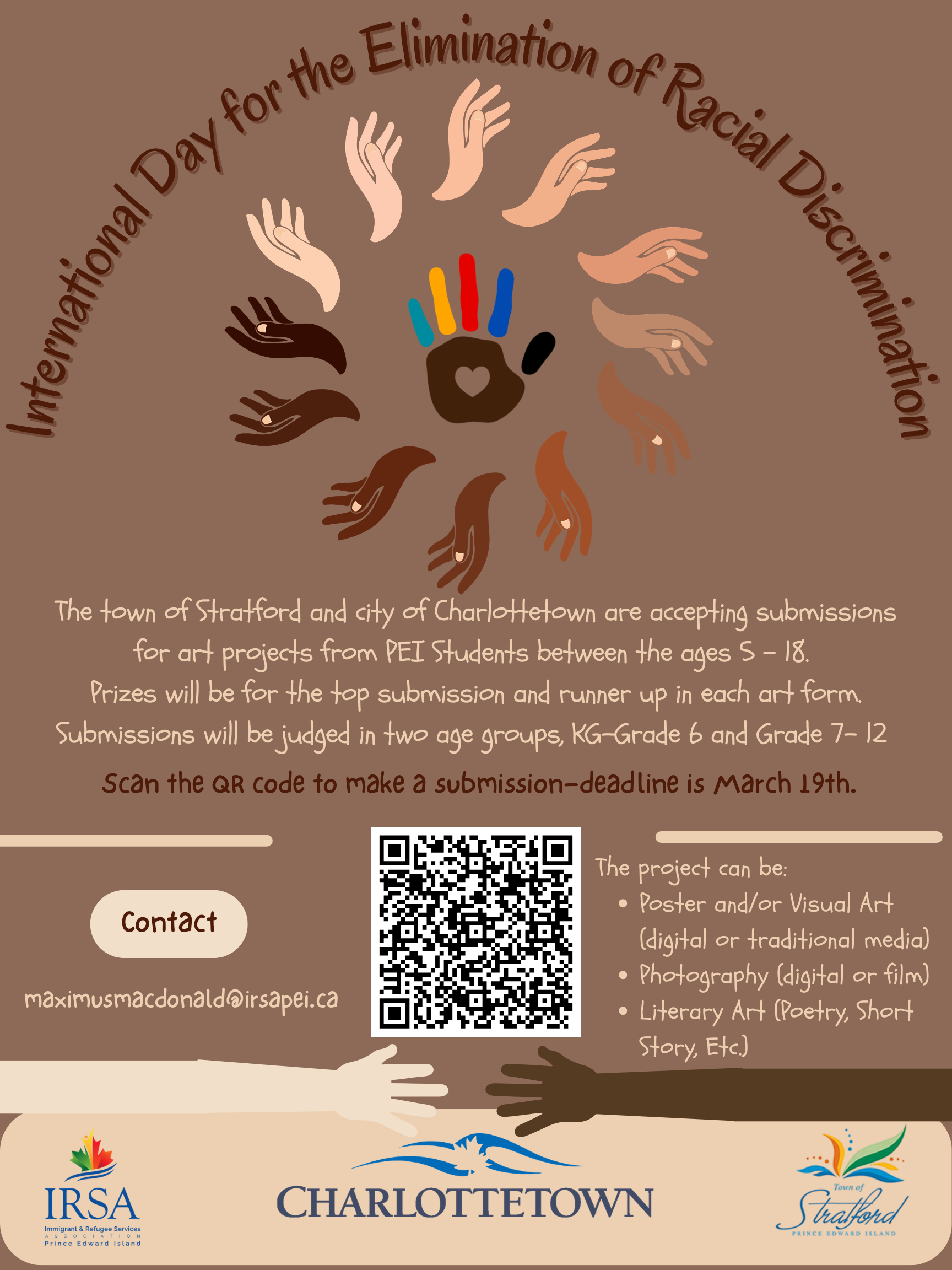 To mark the International Day for the Elimination of Racial Discrimination (March 21, 2026), the Town of Stratford is proud to partner with Immigrant & Refugee Services Association PEI and the City of Charlottetown, PE to launch a youth art contest.