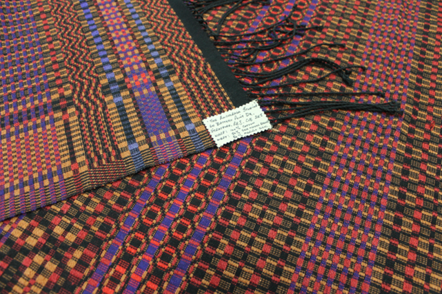 COVERLETArtist/Designer: Cheryl LivingstonLocation: Not currently on display.Description: This woven art was created using 100% cotton for the warp and 50% silk and 50% wool for the weft.*Note: warp and weft are the two components used in weaving to turn thread or yarn into fabric. The longitudinal yarn is called the warp while the transverse weft is drawn through and inserted over and under the warp.