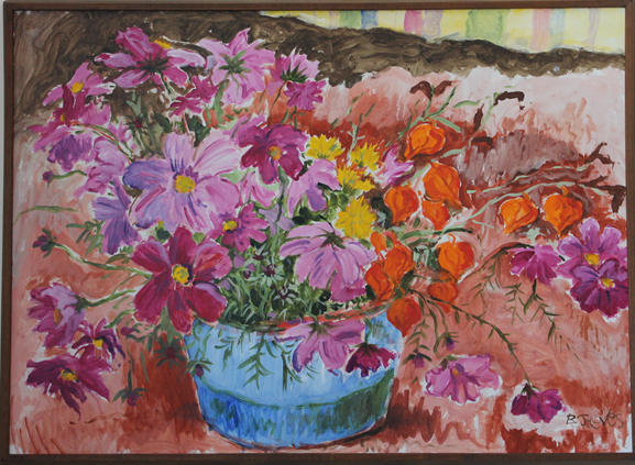 JOAN’S FALL FLOWERS (2009)Artist/Designer: Barry JeevesLocation: Town of Stratford front (main foyer)Description: Acrylic on Masonite board. Joan was the artist’s spouse who received credit for the beautiful fall flower arrangement of Cosmos, Chinese Lanterns, and Marigolds.