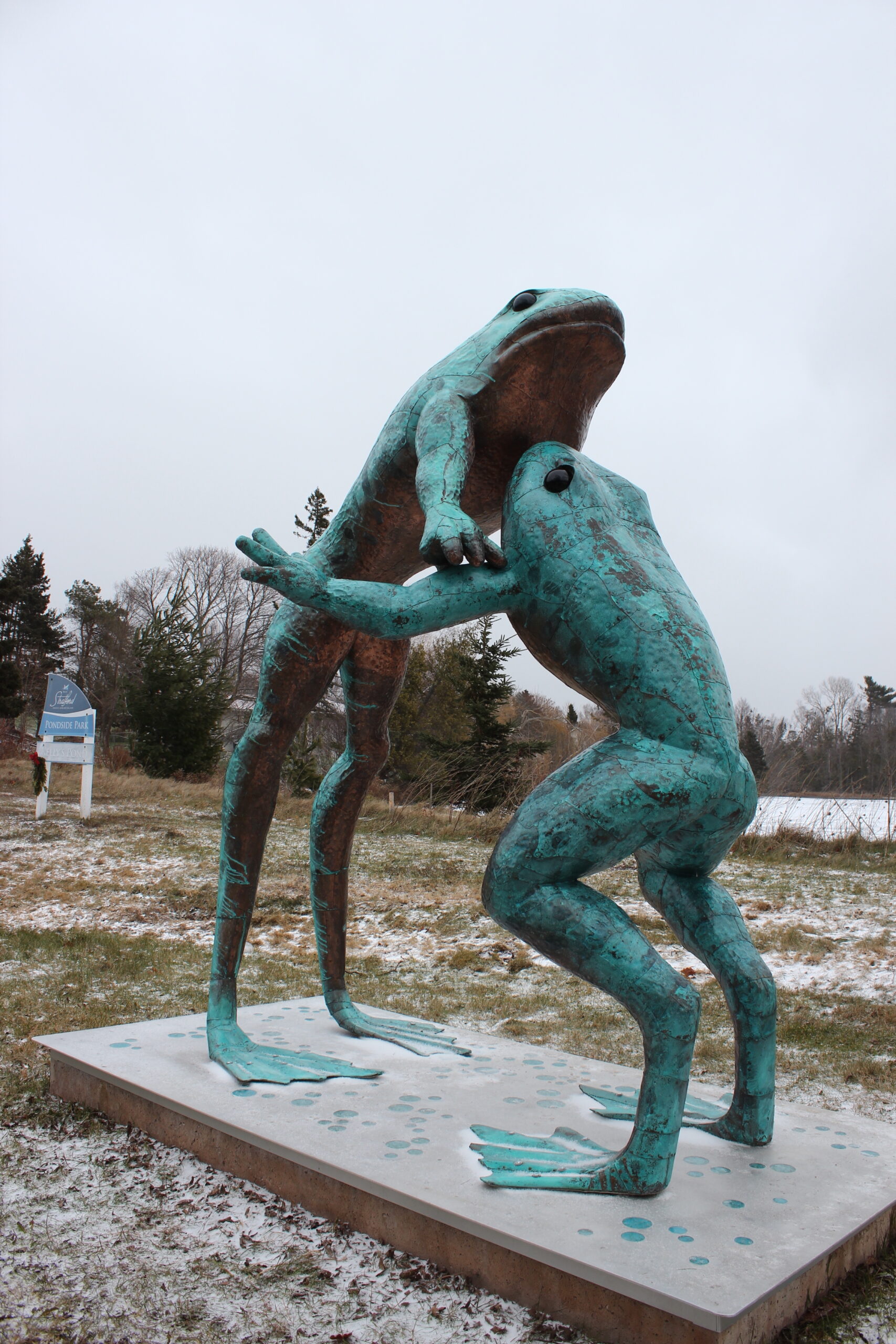 LEAP (2022)Artist/Designer: Gerald BeaulieuLocation: Pondside ParkDescription: Leap pays tribute to the ecology and fauna associated with pond ecosystems. The installation is of one of the most ubiquitous pond side creatures, frogs, and their place in childhood fantasy narratives. Through the use of leaping art, the artist wanted to frame them as dynamic amphibians that bridge the aquatic and terrestrial worlds, and have them engaging playfully with the audience.