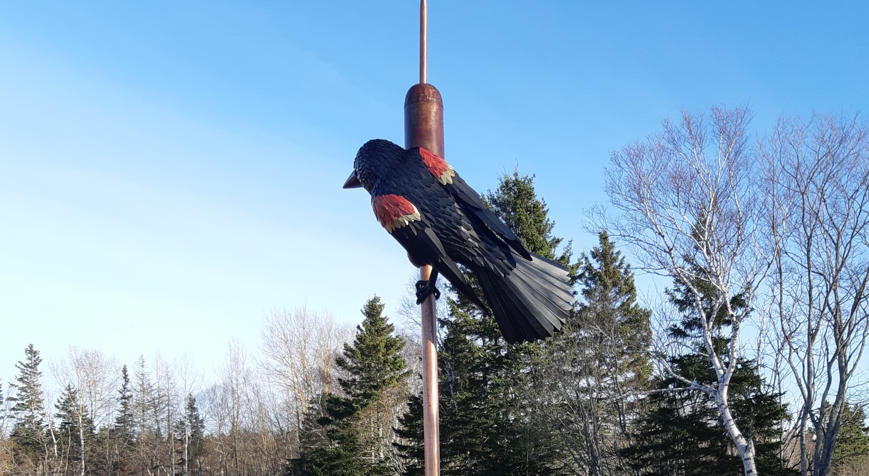 RED WINGED BLACKBIRD (2019)Artist/Designer: Gerald BeaulieuLocation: Fullerton’s Creek Conservation Park (MacIntosh Drive, Reeve’s Estates)Description: This beautiful sculpture was designed and created by the artist to honour the natural wildlife present at Fullerton’s Creek Conservation Park. This piece was created using copper, steel, and wood. The whole sculpture, including the giant cattail, weighs about 800 pounds!