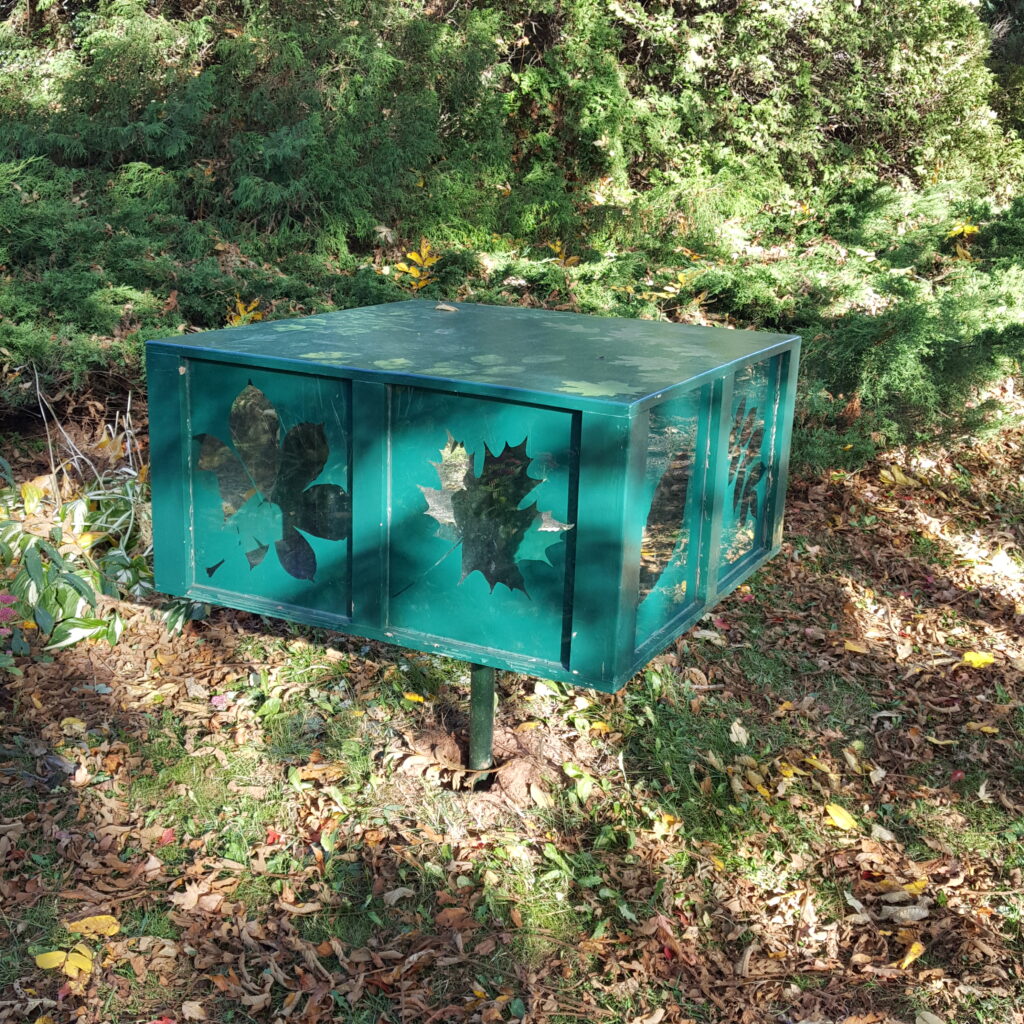REFLECTIVE BOX (2015)Artist/Designer: Terry Dunton Stevenson & Lionel StevensonLocation: Cotton Park (57, Bunbury Road)Description: The artists created a box which allows the viewer to look into one of the four sides and see mirrored reflections of the box’s natural surroundings. The four sides have tempered glass windows in shapes related to nature which reflects various surrounding objects from nature on the mirrors inside. This piece also rotates for the user to change the view.