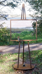 THE EASEL(2015)Artist/Designer: Terry Dunton Stevenson & Lionel StevensonLocation: Cotton Park (57, Bunbury Road)Description: The artists were influenced by artist Rene Magritte’s surrealist painting entitled “The Human Condition” in creating this piece. It has been constructed from metal into a life size 3D piece that looks like an easel with a frame for a canvas. Where the canvas would normally be, the area remains open creating a view of nature around it. A pot of metal brushes attached further adds to the illusion that it is a landscape painted on the easel. The viewer interacts with this piece by rotating the easel and changing the view.