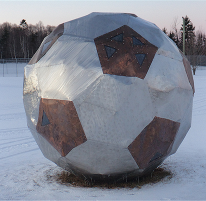 THE SOCCER BALL (2014)Artist/Designer: Ahmon KatzLocation: Kinlock Park (61, Bonavista Ave)Description: This eye-catching artwork was created using steel, copper, and plexiglass. The art installation is also an acoustic instrument.