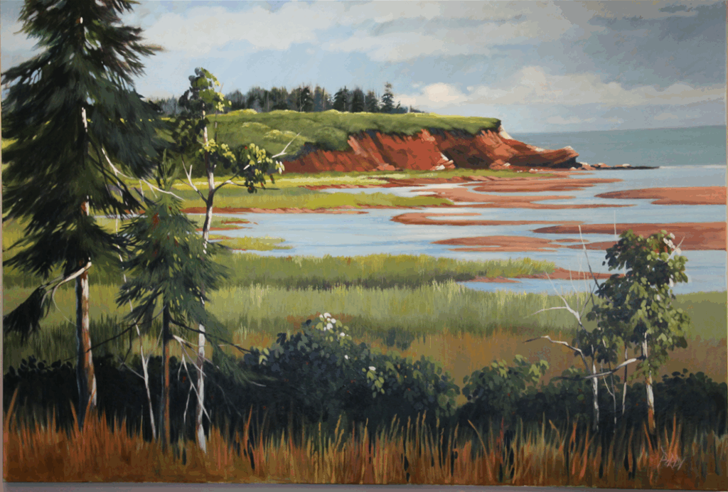 Description: Acrylic on canvas. A melancholy piece portraying the wonder and strength of PEI’s delicate cliffs under winter’s harsh conditions. This piece was donated by Ann Dutton the wife of P.E. Dutton, the artist.