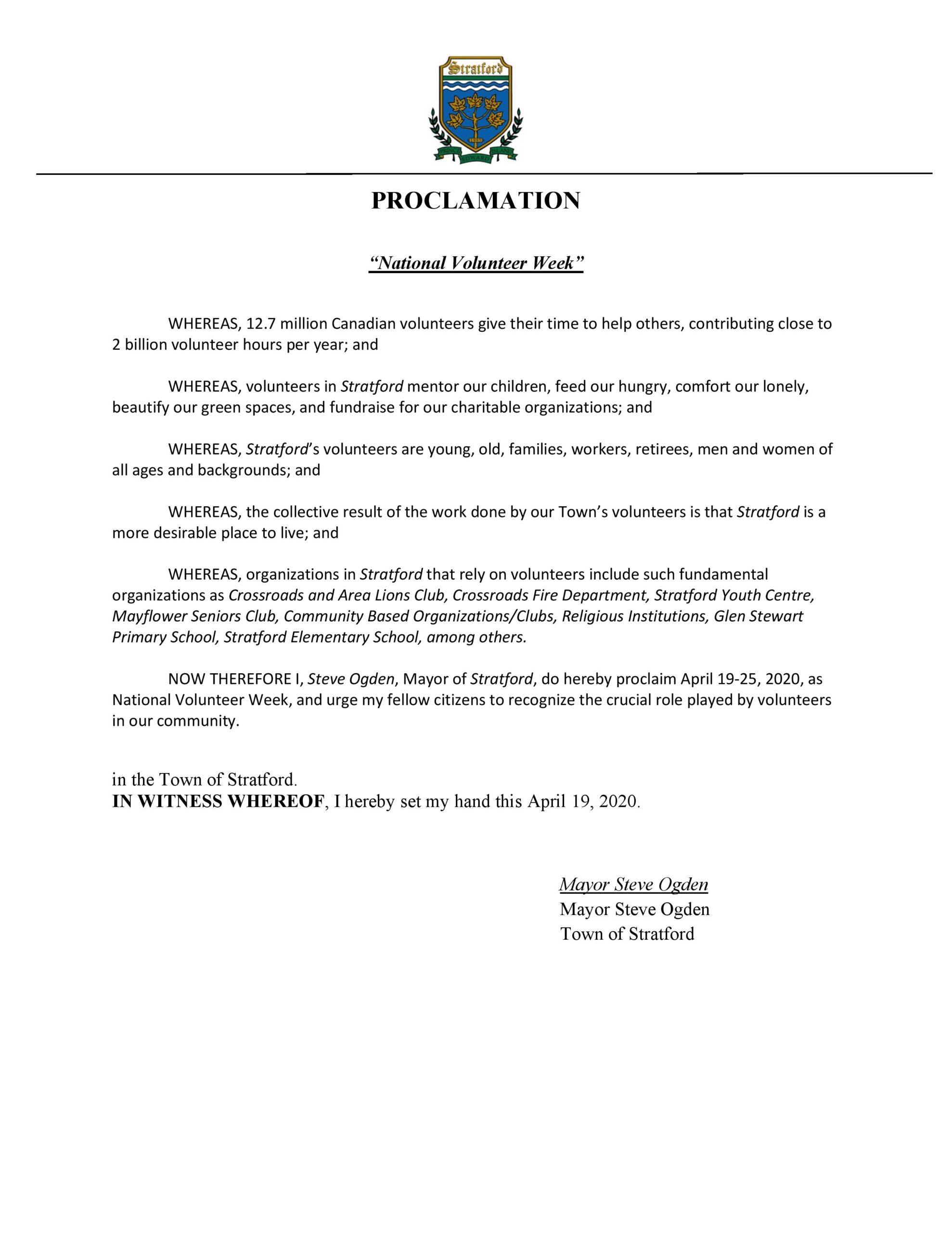 NOW, THEREFORE, I, Steve Ogden, Mayor of Stratford, do hereby proclaim April 19-25, 2020, as National Volunteer Week, and urge my fellow citizens to recognize the crucial role played by volunteers in our community.