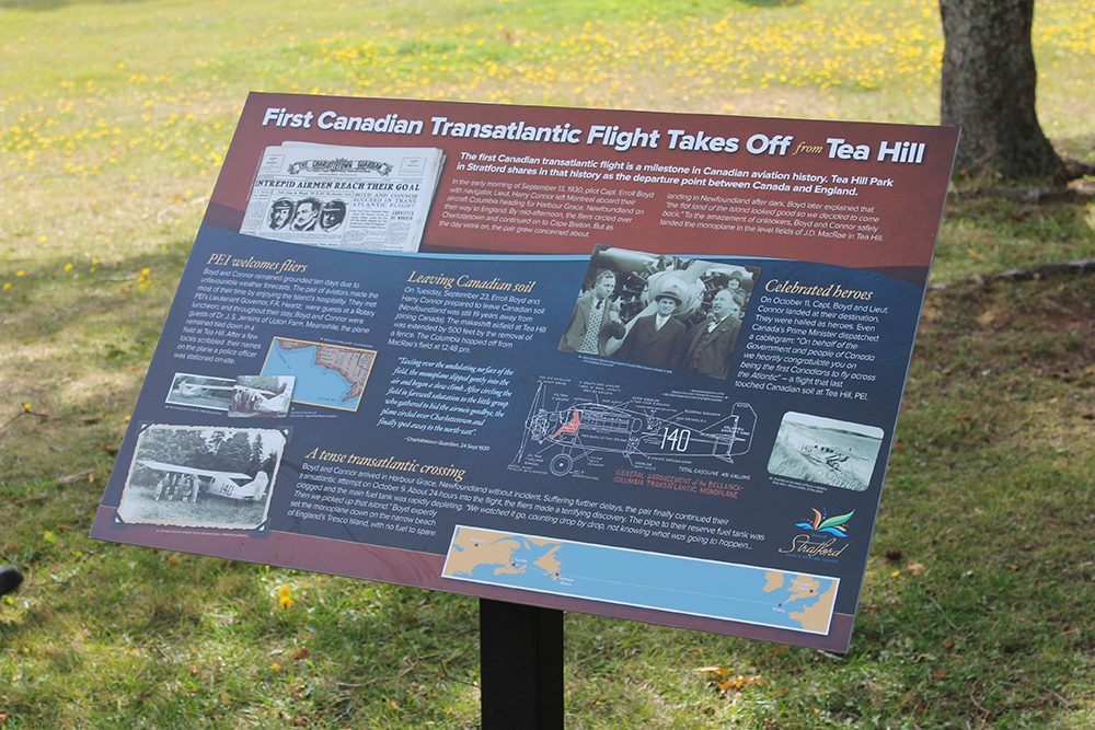 Today at Tea Hill Park an interpretive panel was unveiled telling the story of the location’s direct connection to a milestone in Canadian aviation history. The land, which today is home to one of the Town of Stratford’s community parks, was 90 years ago the departure point for the first Canadian transatlantic flight.