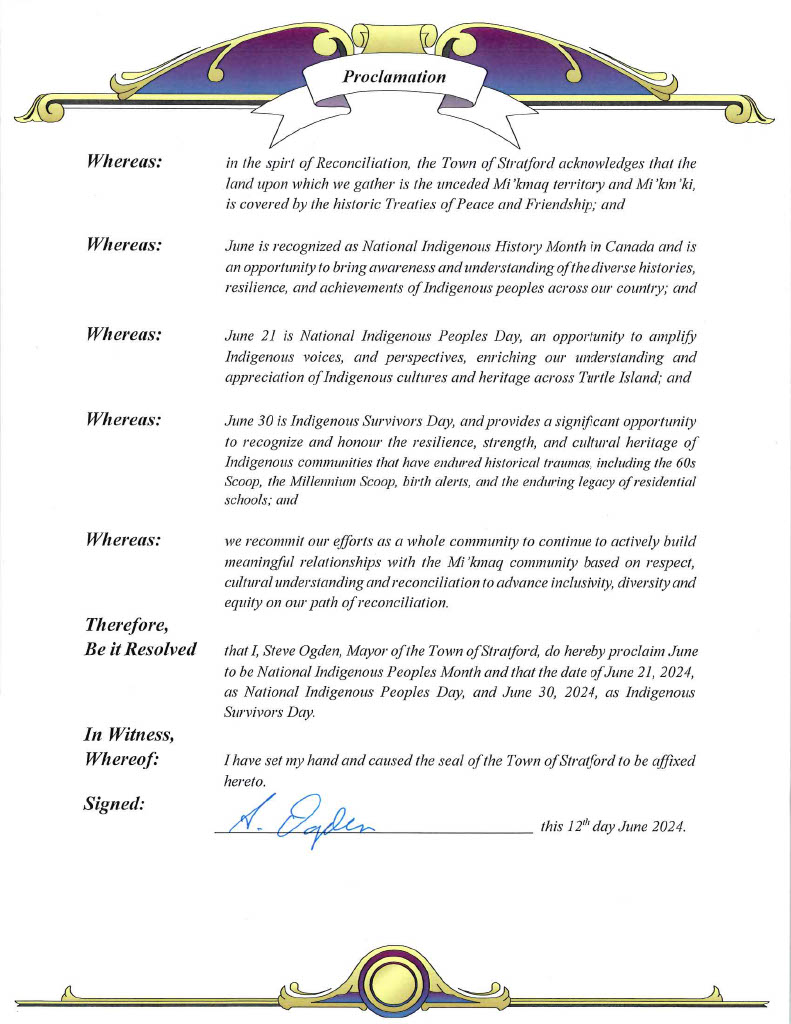 ProclamationMayor Ogden signed a proclamation to recognize June as National Indigenous History Month as well as June 21st as National Indigenous Peoples Day and June 30th as Indigenous Survivors Day. This month, and all year long, residents are encouraged to learn more of our Canadian history and to reflect on where we are today and continue to work towards meaningful reconciliation for the future.